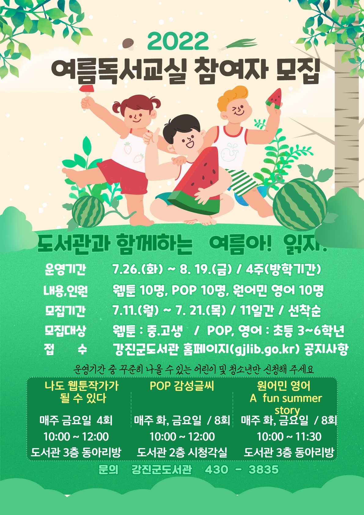 참여를 원하는 어린이와 청소년들은 오는 7월 11일부터 21일까지 도서관 홈페이지(www.gjlib.go.kr)에서 선착순(각 10명) 신청할 수 있으며 기타 자세한 사항은 강진군도서관(☎430-3835)으로 문의하면 된다.