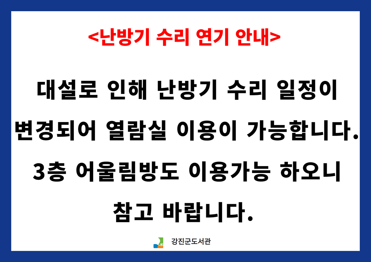 | 다음글 | 강진군도서관 성탄절 및 신정 휴관안내 | 2022-12-23 |