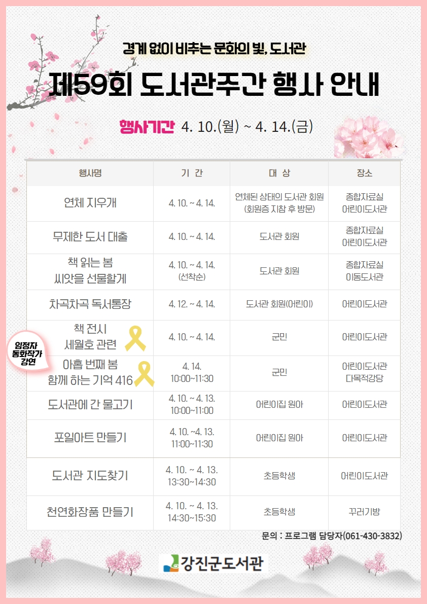 | 다음글 | (마감)2023년 강진 책 달림 (독서릴레이) 안내 | 2023-04-06 |