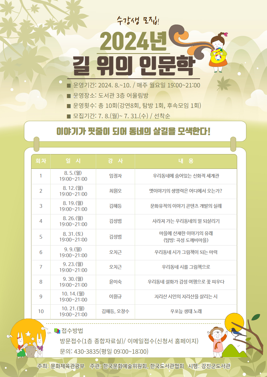 | 이전글 | 2024년 여름 독서교실 참여자 모집 (모집 완료) | 2024-06-28 |