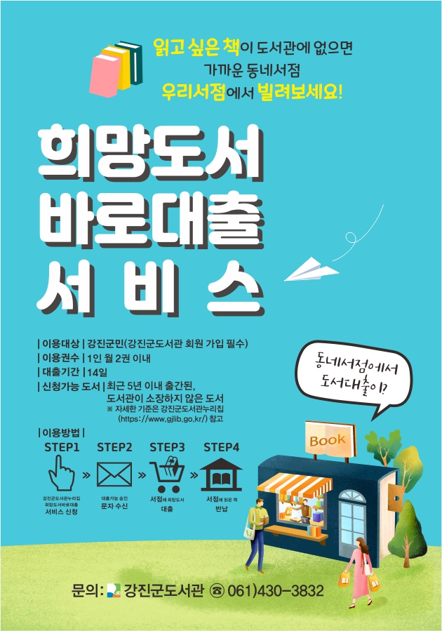 ■ 절 차: 이용자가 읽고 싶은 책 선정 → 강진군도서관 누리집에서 도서 신청 → 이용자 승인 문자 수신 → 회원증 지참하여 서점에서 도서 대출 → 도서 이용 → 서점으로 도서 반납