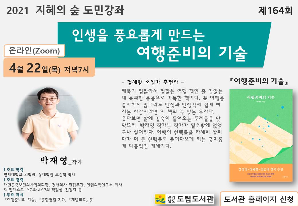 제164회 지혜의 숲 도민강좌 [박재영 작가의 인생을 풍요롭게 만드는 여행준비의 기술]