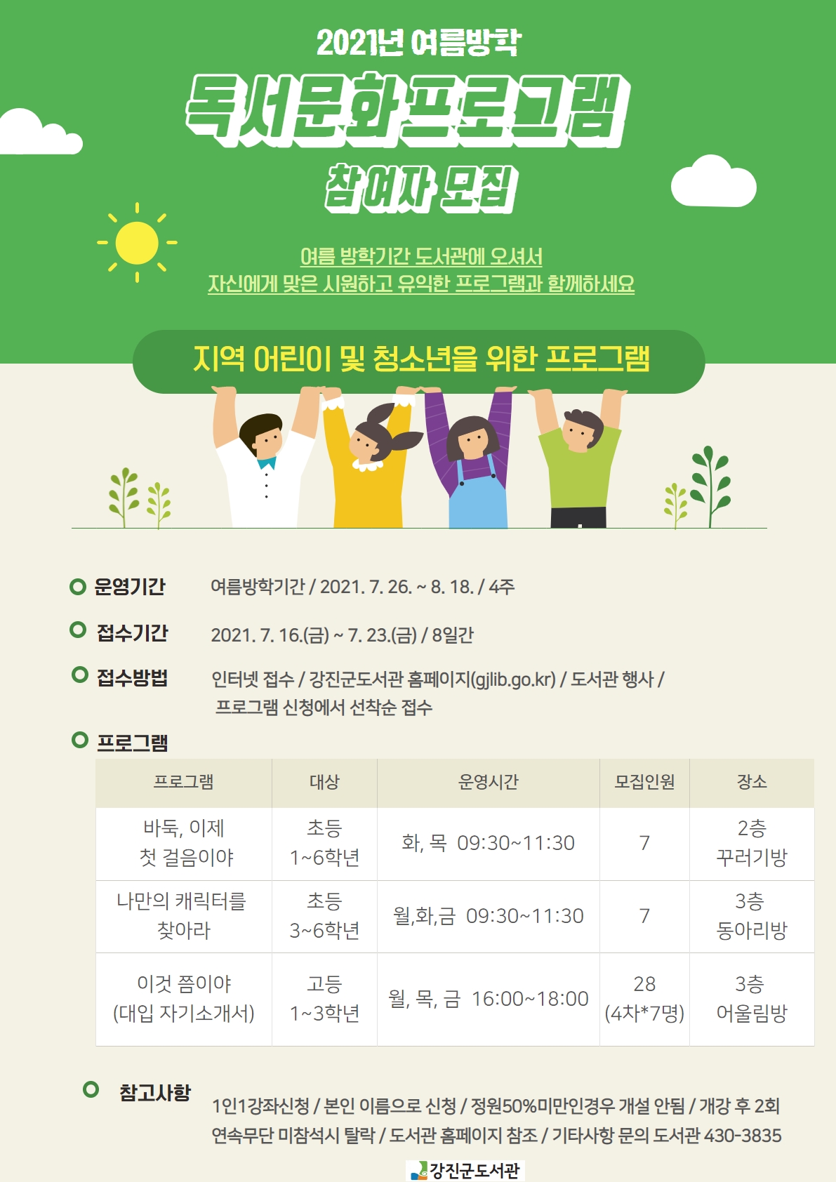 모집기간: 2021. 7. 16.(금) ~ 7. 23.(금) / 선착순 / 도서관 홈페이지 접수