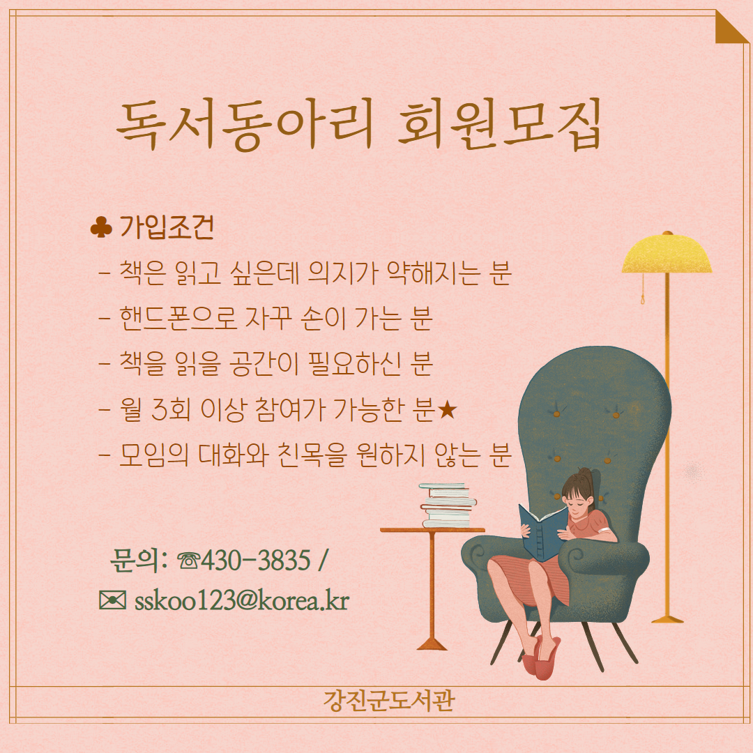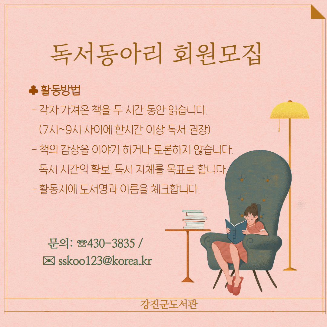 5. 매주 수요일 저녁 7시~9시 두시간 도서관 2층 시청각실에서 자신이 좋아하는 모든 책을 자유롭게 읽습니다. (한시간 이상 독서 권장)