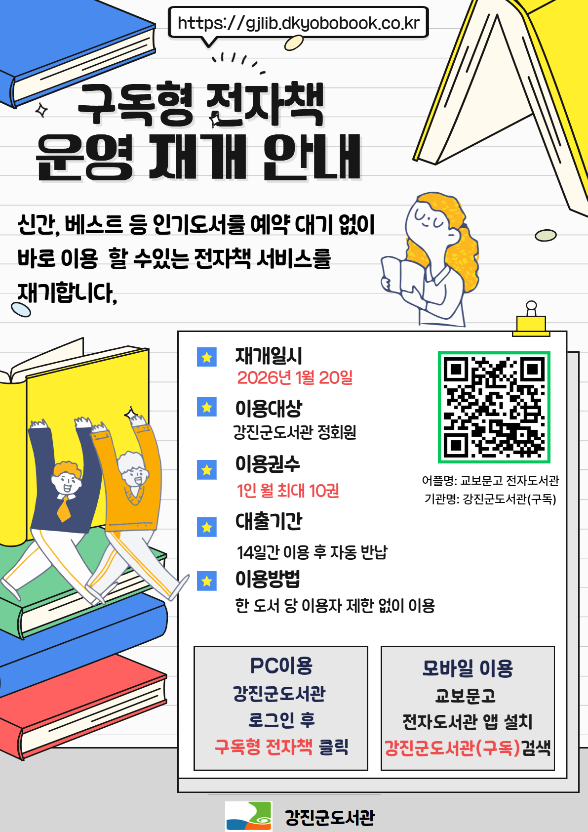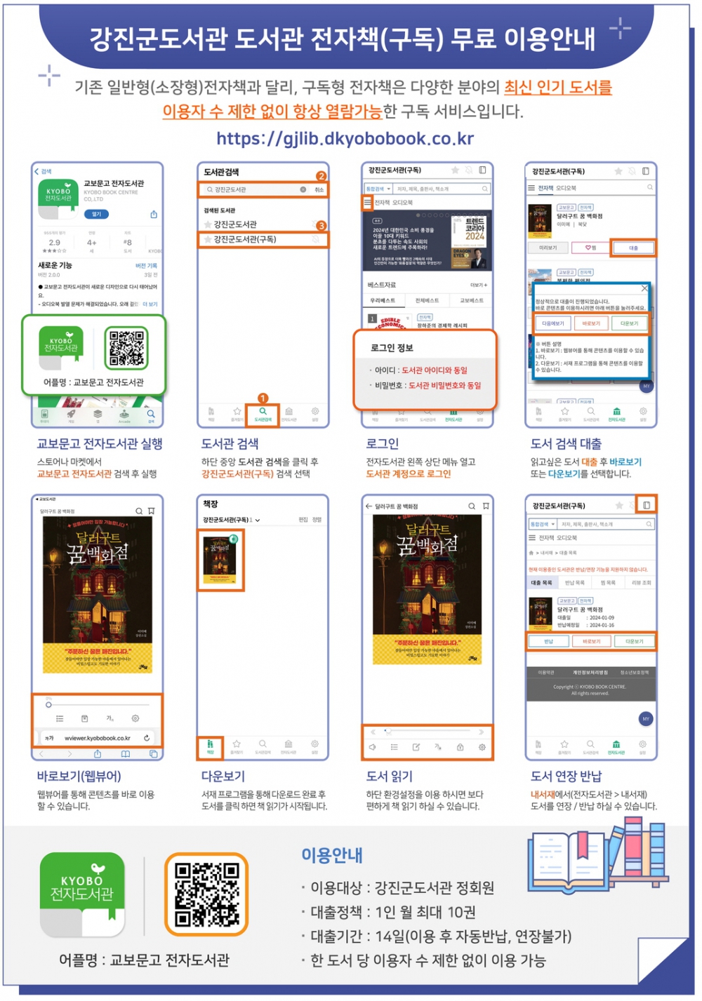 모바일: ‘교보문고 전자도서관’ 앱 설치 → 하단 중앙 도서관 검색에서 강진군도서관(구독)검색)