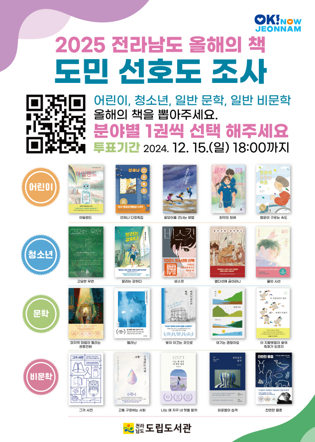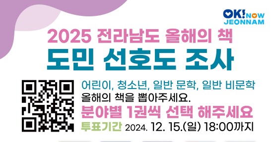 이에,「2025 전라남도 올해의 책」선정에 도민의 의견을 반영하기 위해 다음과 같이 '온라인 도민 선호도 조사'를 실시하오니, 많이 참여해주시기 바랍니다.