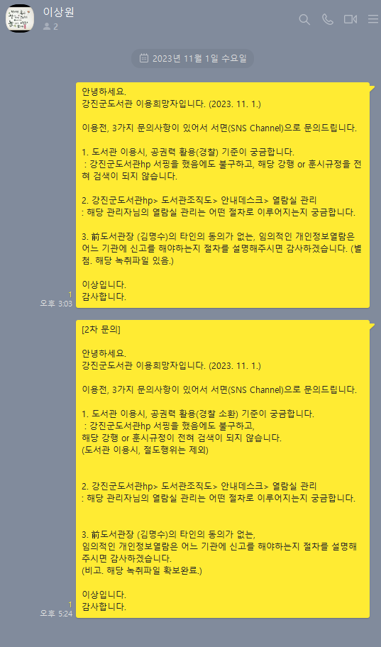 그래서 22.10 중순부터 도서관 열람실 관리자님께 주기적으로 열람실 모니터링을 요청함. (환기, 실내 마스크 미착용자 제재 등) 하지만 해당 관리자님은 전혀 어떠한 조치가 이루어지 않았음. (수십차례 제가 1층 로비로 내려가서 요청을 했었음.)