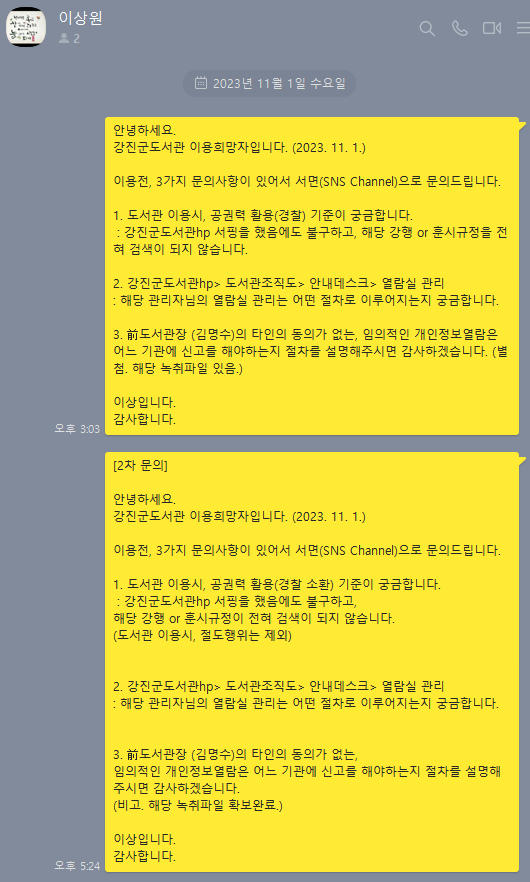 4) 2023. 11.1. SNS Channel를 통해, 주무관 이상원에게 2022. 2. 21. 공권력행사에 관하여 문의를 했었는데, 어떠한 답변준비중이라던지 또는 답변거부라는 응답을 듣지 못함. (조용히 해당 사건을 해결할려는 목적이 있었음.)